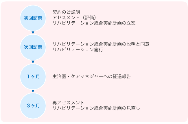 理学療法士がご自宅を訪問し、ご家庭で実施できる運動プログラムを作成・実施いたします。